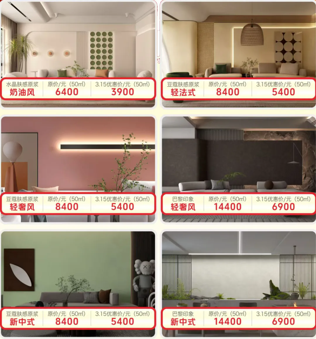 如巴黎印象涂装(zhuāng)套餐原价14400元/50㎡,现315大促活动只需6900元/50㎡,立减52%!